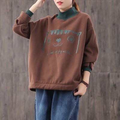 【绿素棉】2020秋冬 宽松休闲加绒大码 卡通高领卫衣女慵懒风上衣