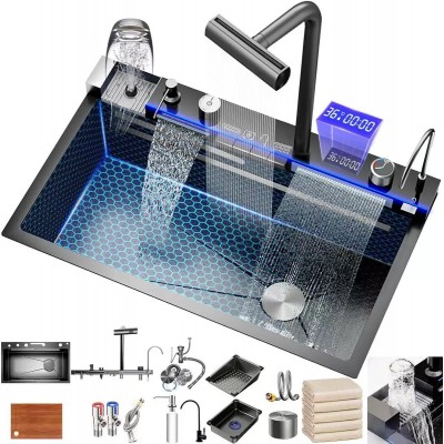 厨房水槽加厚洗菜盆钢琴蜂窝龙鱼厨房单槽数显瀑布飞雨不锈钢水槽