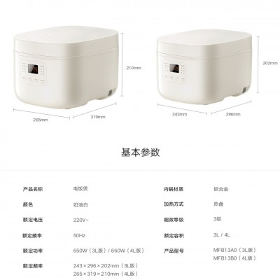 产品尺寸243*296*202mm (3L版) 265*319*210(4L版)功率800W以下