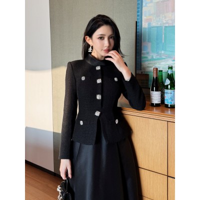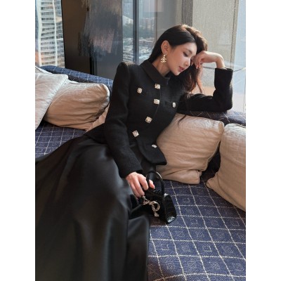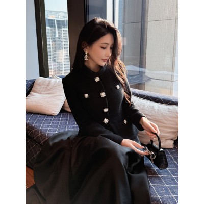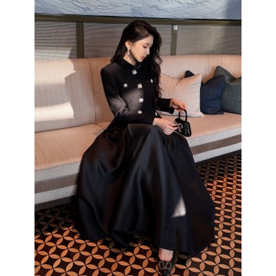 首页 > 男装 / 女装 / 内衣 > 女装 > 连衣裙 > 2025秋冬新款女装黑色粗花呢拼接优雅气质长袖小立领连衣裙晚礼服